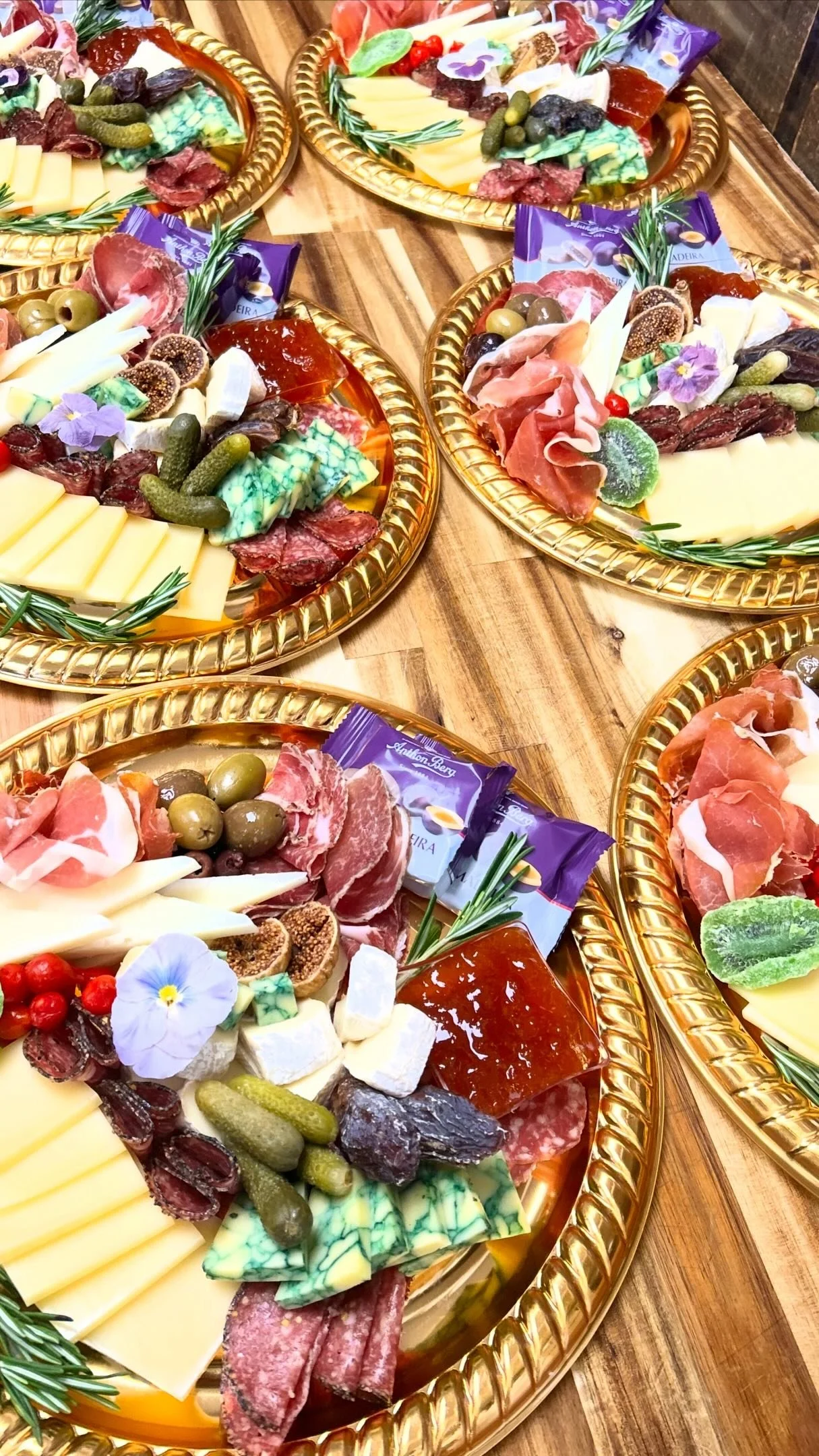 Items included in every cheese & charcuterie board: cheese, charcuterie, dried fruit, cornichons, olives, sweet drops, and nuts. Occasionally, chocolate may be included.